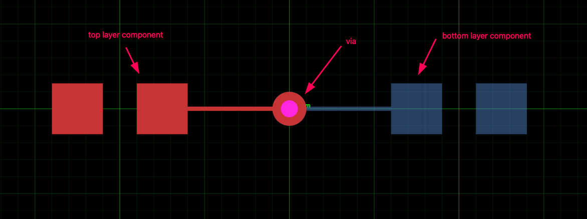 We represent traces in PCB viewers with different colors depending on what layer they fall on. In tscircuit, traces are always autorouted, so you don't need to tell it which path to take- it'll automatically find one that makes sure it doesn't cross any other traces.