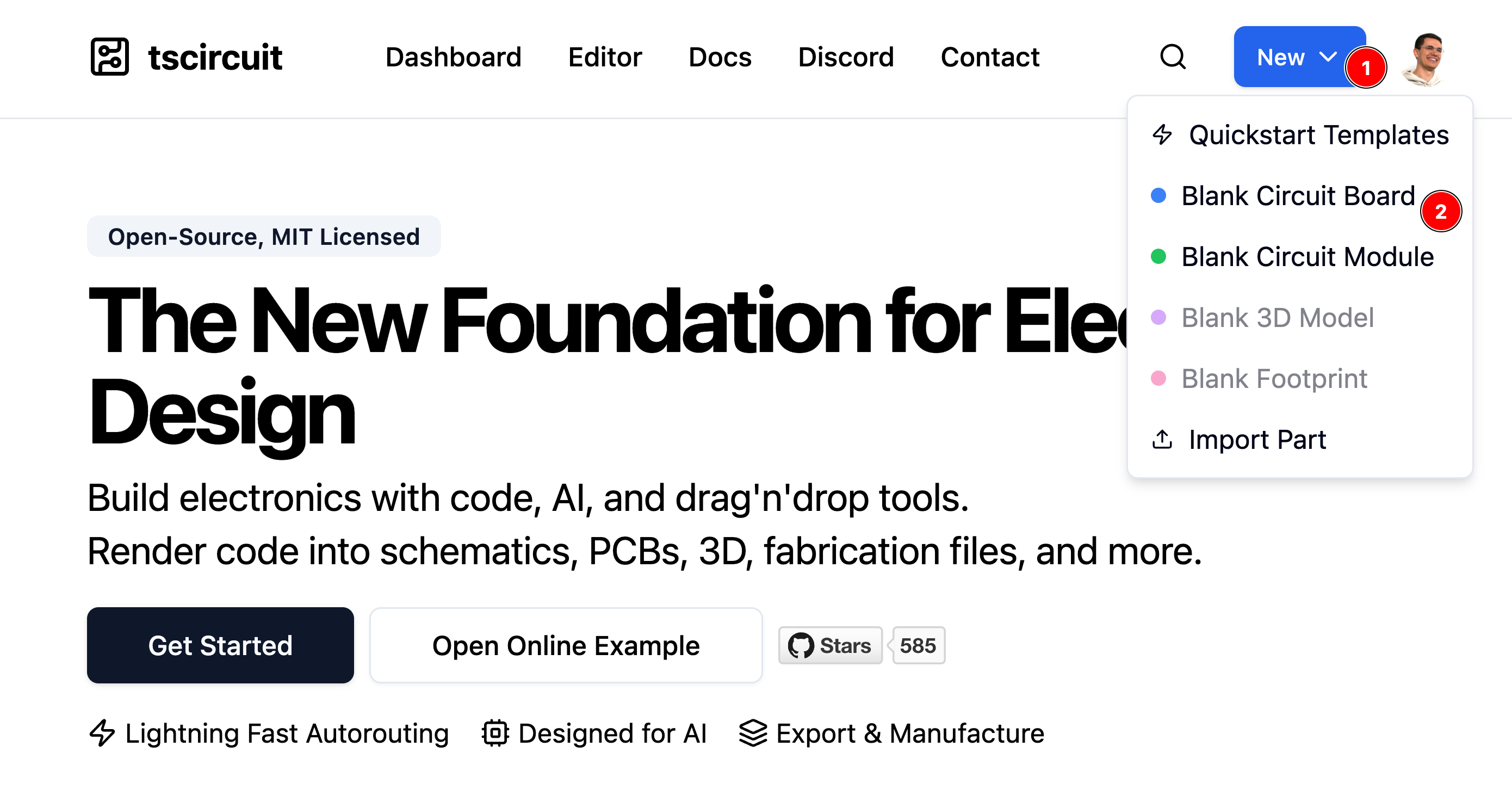 The tscircuit online editor is a full Typescript editor with syntax highlighting, autocomplete, type-checking and tools for importing snippets and configuring chips.